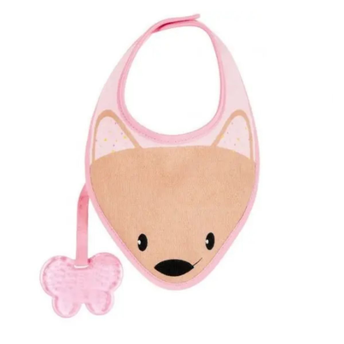 Variant rozë i aksesorit 2 në 1 për fëmijë. Ndihmon në daljen e dhëmbëve dhe mban rrobat e pastra. E bërë nga materiale të buta dhe rezistente për përdorim të përditshëm. Ideale për fëmijë mbi 3 muaj.
