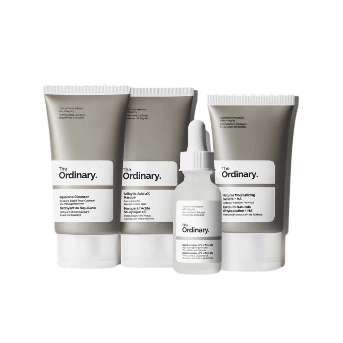The Ordinary Squalane Cleanser 50 Ml është një larës për fytyrën i cili eleminon make-upin dhe papastërtitë në lëkurë. Formula e tij delikate pa sapun, pastron në thellësi lëkurën pa e irrituar atë. Pas përdorimit fytyra qëndron e butë dhe e hidratuar. I përshtatshëm për të gjitha llojet e lëkurës. Maska me acid Salicilik 2% luan një rol të rëndësishëm në eksfolimin e qelizave te vekura të shtresës së jashtme dhe reduktimin e yndyrës së tepërt. Formula e saj përmban baltë dhe qymyr të cilat eleminojnë pikat e zeza dhe papastërtitë. Falë përbërësve aktivë, maska rregullon njollat dhe shenjat ekzistuese të lëkurës si dhe parandalon formimin e akneve të reja. E përshtatshme për lëkurë mikse, të yndyrshme dhe me tendencë akneike. The Ordinary Natural Moisturizing Factor Ha Cream është një krem hidratues i përshtatshëm për të gjitha llojet e lëkurës edhe ato sensitive. Formula e saj e pasur ka në përmbajtje kombinimin e acidit Hyalorunik, aminoacide, acide yndyrore, trigliceride, ure, ceramide, fosfolipide, glicerinë të cilat ushqejnë deri në thellësi si dhe fortësojmë shtresën e jashtme të lëkurës. Kremi përthithet shpejt dhe në mënyrë të njëtrajtshme pas aplikimit si dhe nuk lë ndjesi yndyre në lëkurë. The Ordinary Niacinamide 10% + Zinc 1% ështën një serum hidratues i përshtatshëm për lëkurën e yndyrshme dhe atë me tendencë akneike. Ka në përmbajtje kombinimin e Niacinamideve dhe Zinkut të cilat ndihmojnë në eleminimin e imperfeksioneve në lëkurë dhe minimizojnë poret. Ka një teksturë të lehtë dhe përthithet shpejt e në mënyrë të njëtrajtshme nga lëkura.